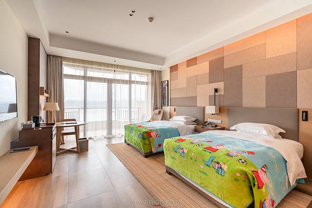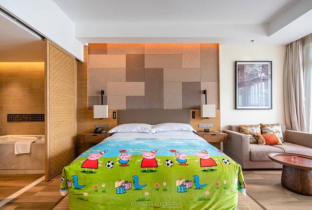 我们入住的是亲子套房, 是大床房和双床房的连通房,空间十分宽敞而且房内装饰非常贴合儿童的主题,床单也用上了小猪佩奇的图案,太有爱了!小侄子进来房间看到后都开心到不得了。