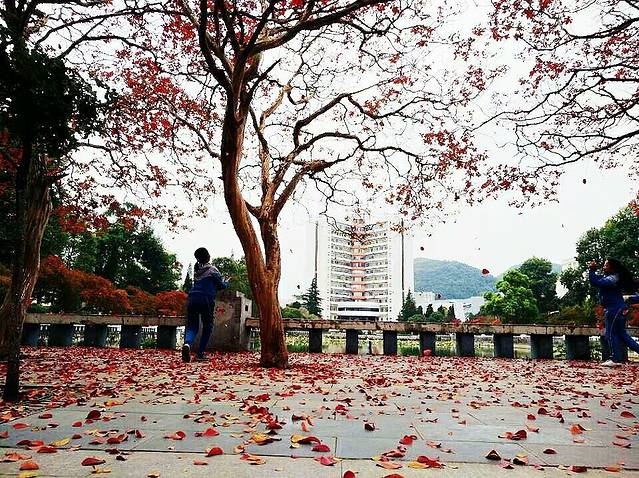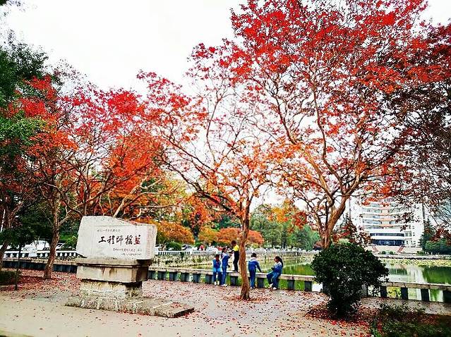 红色是收获的热情,也是希望的象征。满地的红色叶子和天池对岸的主楼也相得映彰。穿着校服的学生开始享受他们疲惫一天的闲暇时光。落下的红叶让他们的笑脸愈发灿烂。