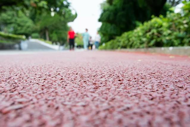 天池旁的公路上,增加了健康跑道。体现了绿色校园的理念。