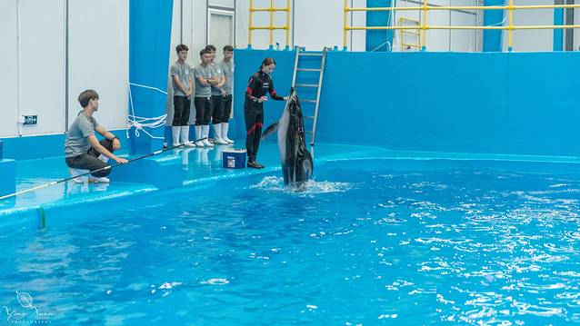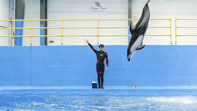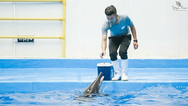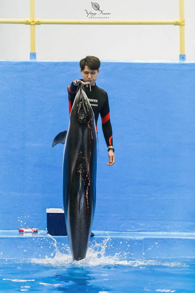这里驯兽师都是从 日本 培训来的,相当专业,我们进入馆参观,他们正在训练海豚,馆长是位 日本 老奶奶,相当慈祥,示意他们可以给我们表演下。