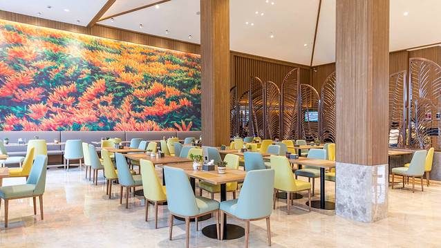 翠香园全日餐厅就在酒店的一楼,中午供应的是自助餐,这个餐厅面积还是很大的,随意找了个位置坐下,很舒适,休息了一会,准备去拿点吃的。