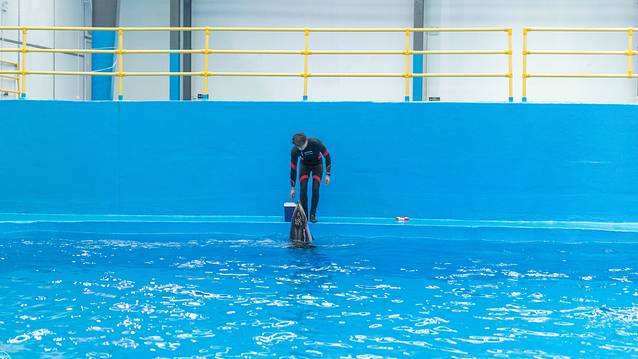 得知我们入住酒店客人可以购买相应的套餐与海豚来次亲密接触,这让我兴奋坏了,赶紧约了时间,来到暂养馆,进入馆内先要换上统一的雨鞋,进行消毒,然后工作人员便带我们来到了海豚宝宝身边。