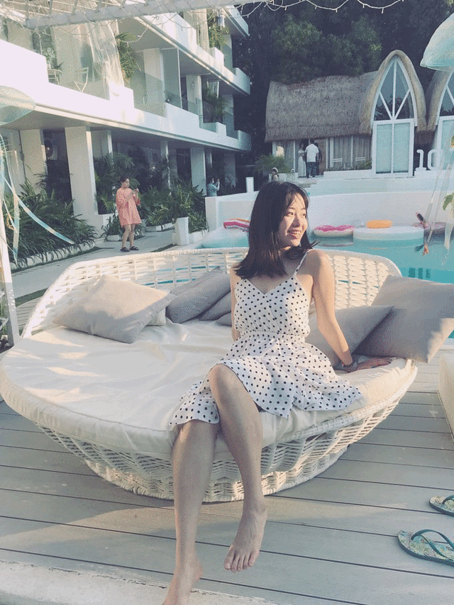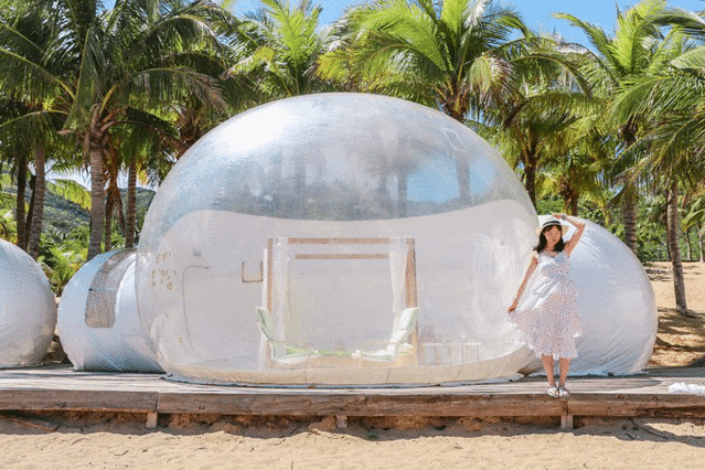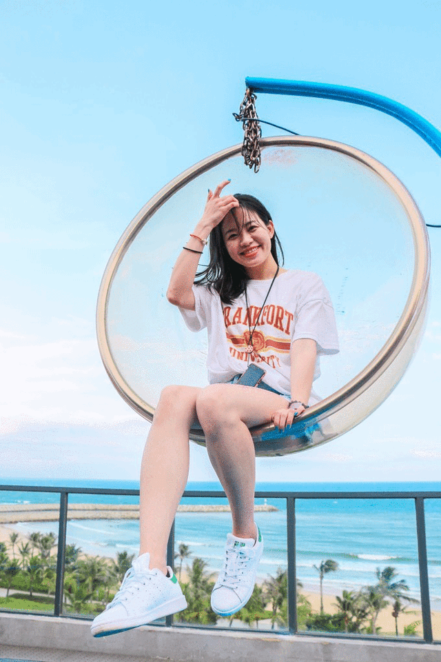 坐上玻璃球就好像坐上了摇摇晃晃的秋千,看着碧海蓝天,身体随着惯性的摆动,也把浪漫的夏天绕成圆圈圈。都说女孩子幻想住进玻璃球里,开始我还不信,然后自己在玻璃球里拍照后,回头看照片发现自己露出好灿烂的笑容。
