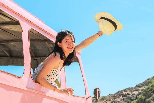 观光车沿着海边小路行驶,放眼望去海水的碧蓝透彻可见,微微热的海风不断吹来,午后的阳光虽然猛烈,但不会背光,所以此时拍出来的景色非常好看。还看不够车上的海景,很快就到达呆呆了。