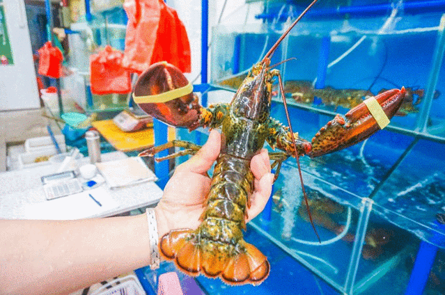 听说第一市场里头太多“水”了,所以直接在店里挑选海鲜比较透明,在选购时,海鲜推销员给我捞出来好多只活蹦乱跳的龙虾对比,遇到了我没见过的海鲜,他很热情地捞出来不厌其烦地给我介绍,给我这个海鲜盲补了不少功课。