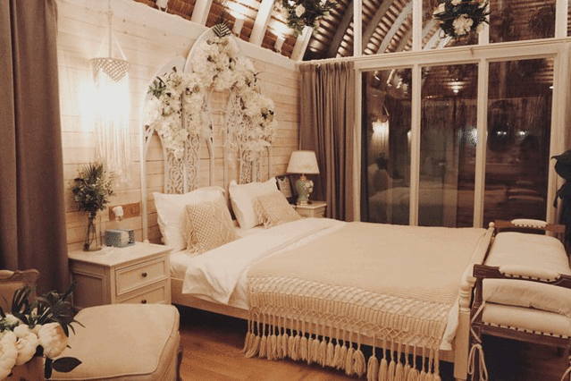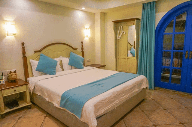 茅草房的装修风格很别致,进来茅草屋就感受到了一种 摩洛哥 式的异域风情,三面都是落地窗,屋内有许多鲜花点缀,有的绽放在墙壁上,有的吊挂在屋顶,十分喜欢这件复古而华丽优雅的房间。