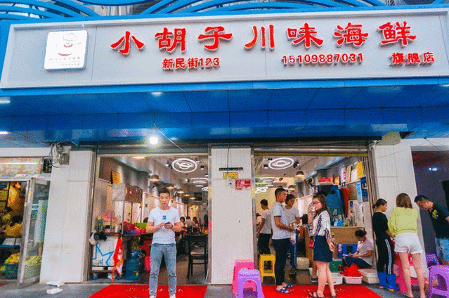 我是一个喜欢吃辣的 广东 人,于是目标直接锁定 三亚 最火的川味海鲜——小胡子川味海鲜。小胡子川味海鲜是一家20年老店,也是第一市场里第一家做川味海鲜的,蓝色的店铺很容易认出来,在 新民 街这里一共有两家,一家是总店,一家是 新店 。到了饭点,来小胡子店里的人络绎不绝,建议大家避开拥堵的用餐时间段。进了门店,服务员很热情地开始介绍今日新鲜的海鲜品类还有“网红菜”。