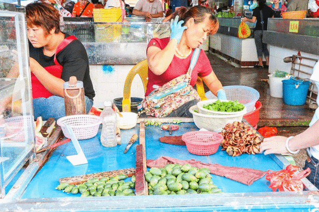 第一市场的海鲜农贸市场不算精致,但却生动地记录着这座城市舌尖上的鲜味历史,街边老旧的居民房透露着沉淀的旧事,喧闹的大街上除了游客,更多的是本地人嚼着槟榔喝着茶的休闲生活,市场里忙碌的商客在讨价还价,特色小吃和热带水果的香味飘香街头,这里是 三亚 市场的雏形。