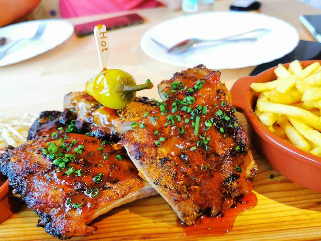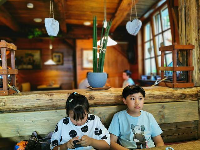 这家餐厅位于山坡上,景色一绝,传统巴伐利亚风味的菜色,烤猪肘,德国香肠等等都能吃到,配菜都是薯条,可把小魔怪们乐坏了,吃得那叫一个风卷残云的……