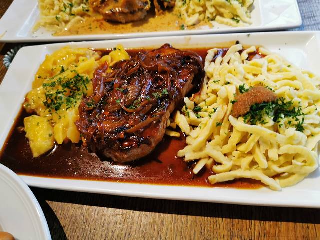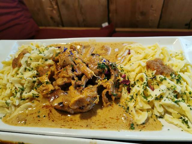 这家是比较传统的德式乡村口味的菜肴,有我喜欢的面疙瘩,分量很感人,小心真的不要点太多…… 我有提前几天预订了座位,所以餐厅有留一张大台给我们六人在室内,室外的座位都满了,欧洲人真的很喜欢坐室外,不过也难怪,空气真的很好很舒服~