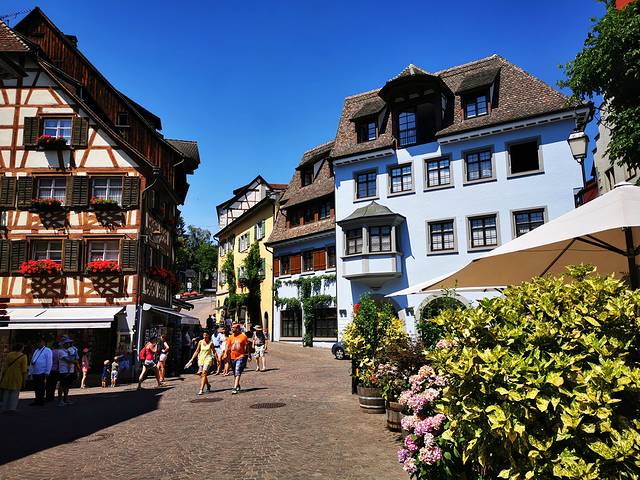 梅尔斯堡是一座建在山坡之上的小镇,面朝着博登湖,城堡及葡萄酒庄等景点都集中在山坡之上的集市广场Marktplatz附近。一座座典型欧洲小镇的浅色系木格小屋错落于此,甚是可爱。