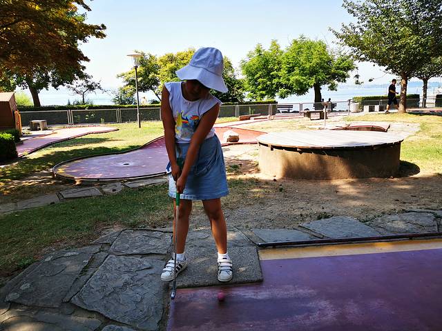 来到这么可爱的小镇,决定放慢脚步好好感受一下它的美好,今天一整天都很懒散地在小镇中游荡,小体验了一下旅居生活,4小只昨天瞥到了泳场附近有minigolf, 今天一早吃完早餐就闹着要去玩,游水吃冰,满满的度假feel~