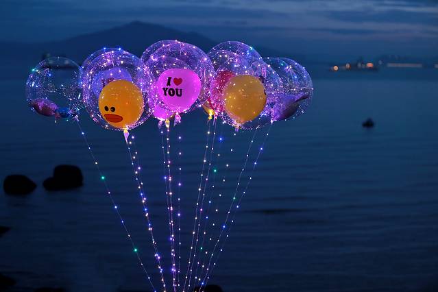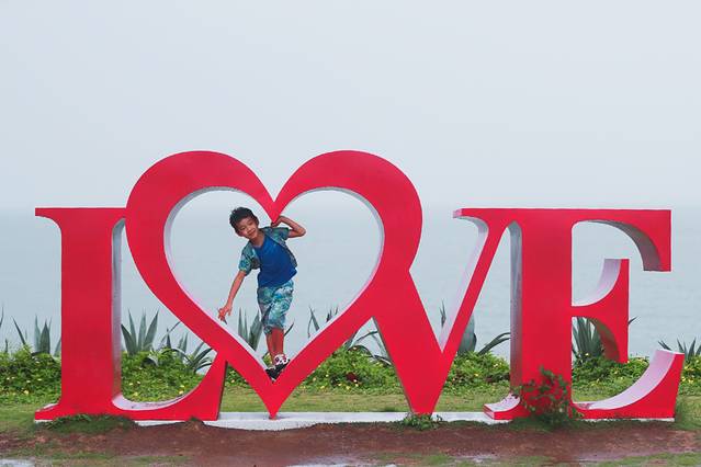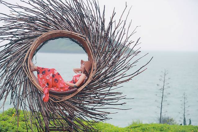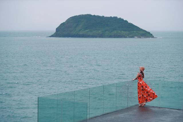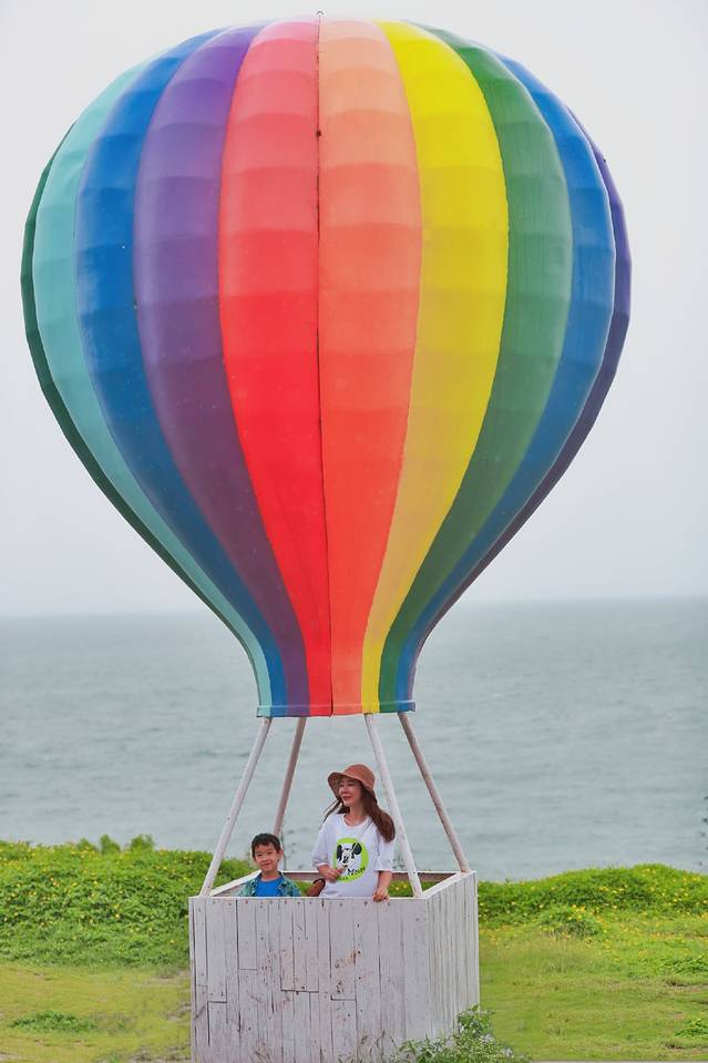 可能是因为下雨吧,岛上人很少,所以可以随便凹造型,在网红巴士不远处,还有面朝大海的秋千以及彩虹的热气球,对莹莹来说,完全是走不动的~