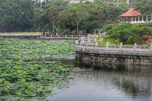 万寿塔前面,是一个荷花塘,塘里设有两个观景亭,在荷花塘和放生池之间的绿地上,矗立着一排 南亚 佛教建筑风格的七佛塔。