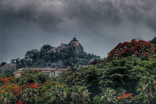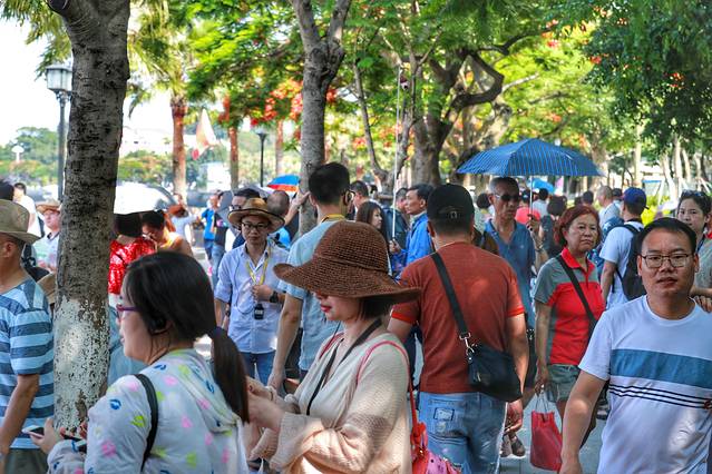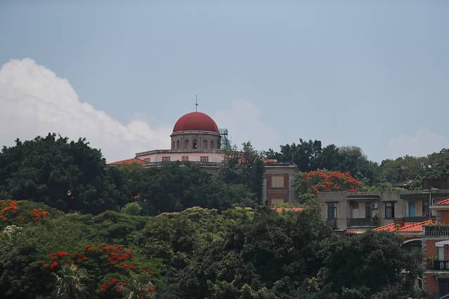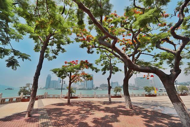 岛上处处绿树成荫,香樟是主要树种,凤凰木、蒲桃已绽放开红的、黄的花朵。