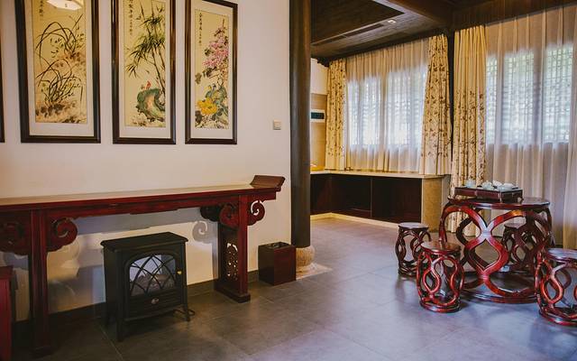 推开古朴的木门,一座座古宅便步入眼前,整个温泉南墅里弥漫着满满的中国风情,白墙红窗,黑瓦朱椽,典栏画廊,木石小桥,紧相毗连,错落有致,却勾勒出一个古色古香、素雅大方的空间;