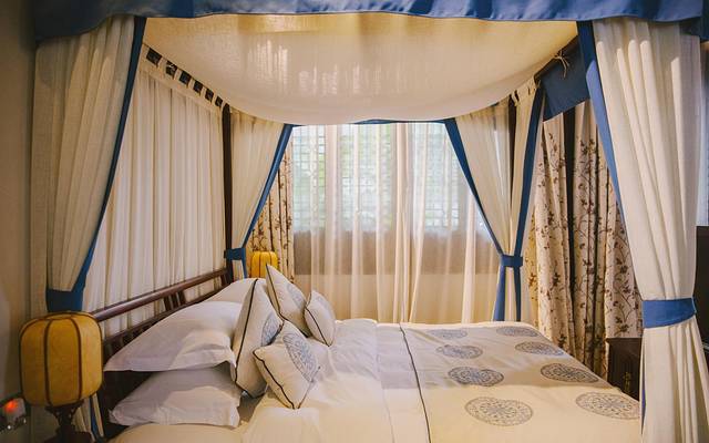 红木色系的房间宽敞温暖,配以中国古典花鸟虫草元素,仿古的原木家具搭配湖蓝色主色更显怀旧浪漫,推开门窗,满目的青翠在心头缱绻地打了个卷~