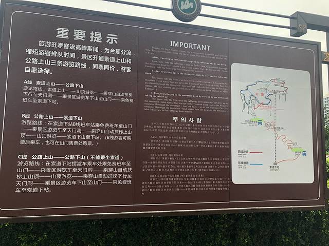 上山线路的ABC线只是怎么上到天门山上,和山顶的游览线路无关哈,不要弄混哦……但是不建议C线 因为上下山都是汽车走“九曲天路”弯度很大,坐着不舒服,而且会错过世界最长的单程索道~所以为了坐上天门山索道,旺季一定要提前订票呀!