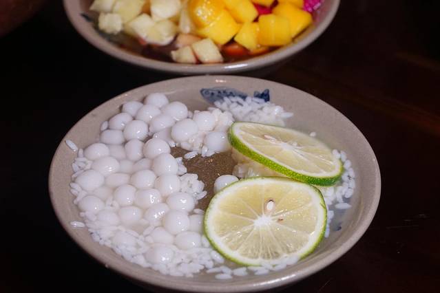 另一种配料是醪糟和小汤圆上面还点缀了两片柠檬哟~入口会有淡淡的柠檬香和很细小的微酸,真的太奇妙了!而且据小丑所知,冰粉上有好多小气孔的是纯手工制作的呢~