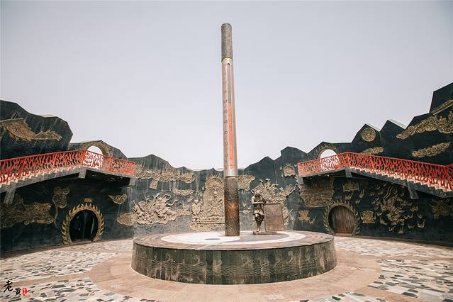 从大堂出来,是一个凹陷的迷你广场,这里摆放着火焰山景区的logo--金箍棒温度计。这是一只测地表温度的温度计,做成了金箍棒的造型,旁边还有个孙悟空的雕塑,侧望着棒子,像是在念着“变大,变大”。非常的有代表性。听工作人员介绍,每年最热的时候,吐鲁番地区的地表温度可以达到80-90度,沙子埋着鸡蛋半小时就熟了。因为地势是盆地,加上每年降水量极少,天气炎热,火焰山之名才孕育而来。