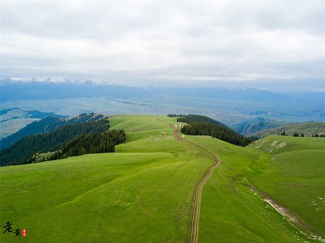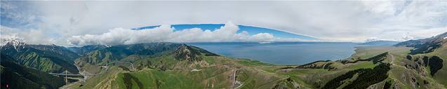 我们并没有进入果子沟景区,只在高点去俯瞰了一下果子沟景色,当然还有那不能错过的果子沟大桥。当通过无人机观看全景的时候,视野放大了果子沟的唯美。首先我们可以看到下图所示,果子沟和赛里木湖的关系,其实就是一山之隔。所以来到赛里木湖旅游的朋友,一定要把果子沟一并打包。因为一山一水,这是两个完全不同的风景模式。在果子沟这边,你需要体会的是雪山之下,绿树青山,青山之中,婉如巨龙的沟壑,异常壮观!
