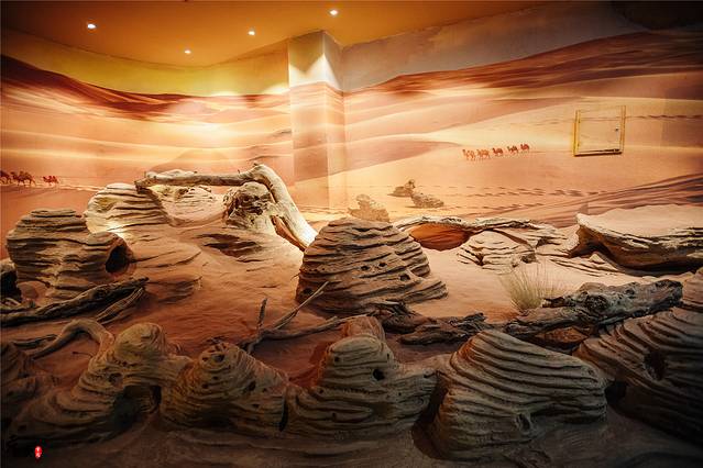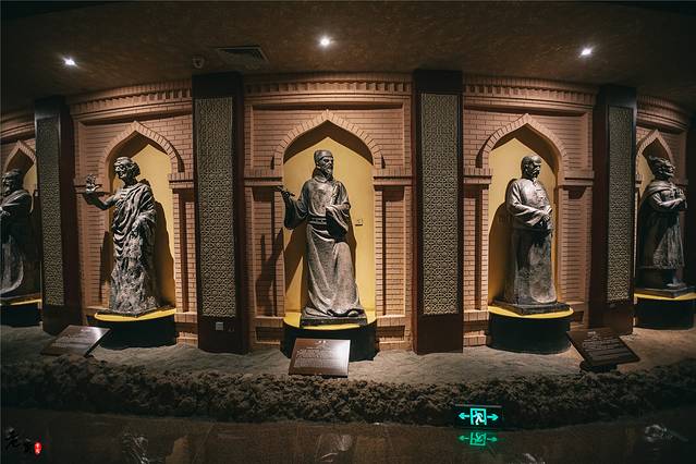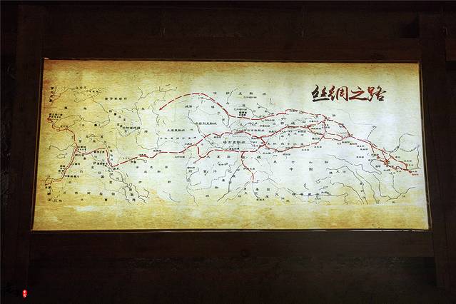 我们在坎儿井源景区,第一部分参观是介绍丝绸之路和西域的展馆。里面呈现了古丝绸之路的路线,以及当时大唐和西域的疆土关系图。还通过雕塑等方式,给大家呈现了一个缩小版的丝绸之路场景,让大家体会一下现在我们引以为傲的丝绸之路,其实在当年是并不好走的。不管是路况还是环境,其实都是恶劣的。当年来往的商队,其实都是冒着很大危险,用自己的脚步去踏出丝绸之路的辉煌。