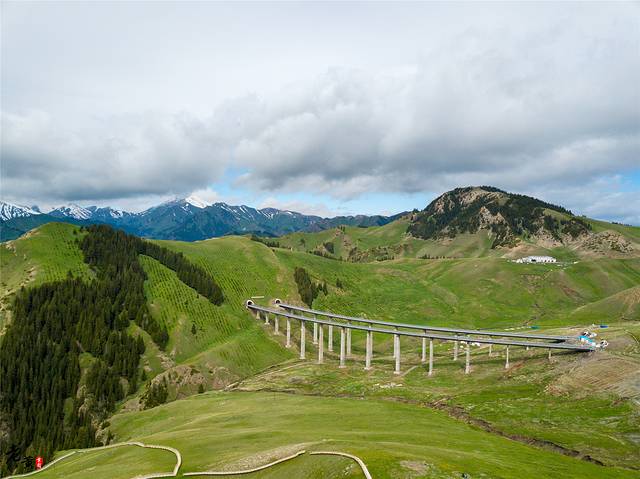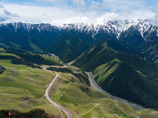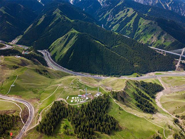 我们可以看到在延绵的山坡之间,一条公路就像是血管一样,连接着每一个山头。有些是绕山而建,有些直接是通过在山体打洞子而建。俗话说,想致富先修路,从空中俯瞰这些人体血管般的公路,心中不禁感概国之盛强。在如此天险之中能修出这样的盘山路,难度不言而喻。但只要做出来就一定是惊世骇俗的。如果自驾果子沟,从这些公路上行驶,两边是青山,远处是终年不化的雪山,这样的风景,难怪很多人会感叹“来了新疆,还去什么瑞士!”
