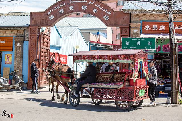 但说到马车,我这里就要给大家分享一个非常有趣的片段,而且这是我们亲身经历的。因为我们是自驾旅行,到了喀赞其第一个动作肯定是找地方停车。我们眼尖,一下子就看到了一个牌子名叫“哈迪克停车场”。按照我们的意识,停车场嘛,肯定是可以停放机动车的。就径直的开进去了。谁知进去后,才被告知,这个停车场不能停机动车,只能停马车。我们当时就纳闷了,马车还要专门的停车场?即使如此那你门牌上应该写清楚只能停马车的字样啊,不然谁知道啊?后来我们才知道“哈迪克”就是维语里的“马”,这样看来别人是在门牌上就写得清清楚楚的,是我们自己没有弄清楚,闹了乌龙。所以这里给所有的看官提个醒,如果在新疆看到“哈迪克”字眼的停车场,机动车就免进吧,不然很尴尬!
