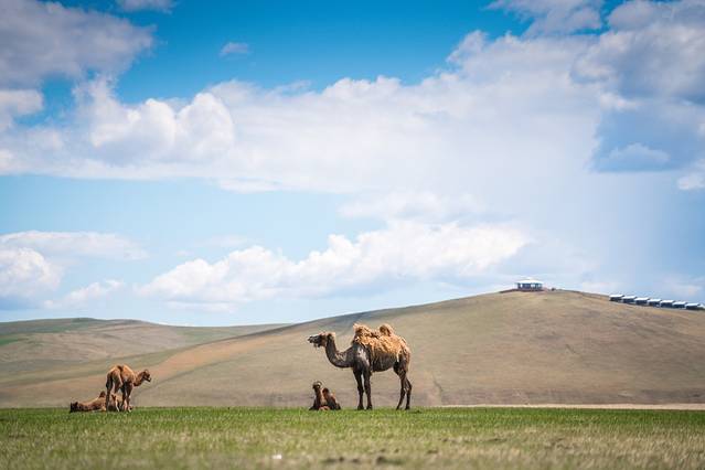 我们开始在草原上寻找动物,没想到第一个出现的居然是骆驼,孩子们都惊呼了出来,远处还没披上青草的小山就像沙丘一般,倒也和谐。只是,夏天快来了,骆驼开始掉毛,颜值颇受影响。
