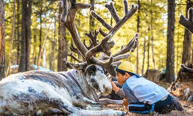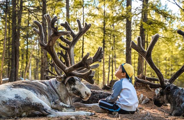 阳光透过树林的间歇洒下来,孩子就坐在驯鹿中间,眼前的画面显得特别的和谐美丽
