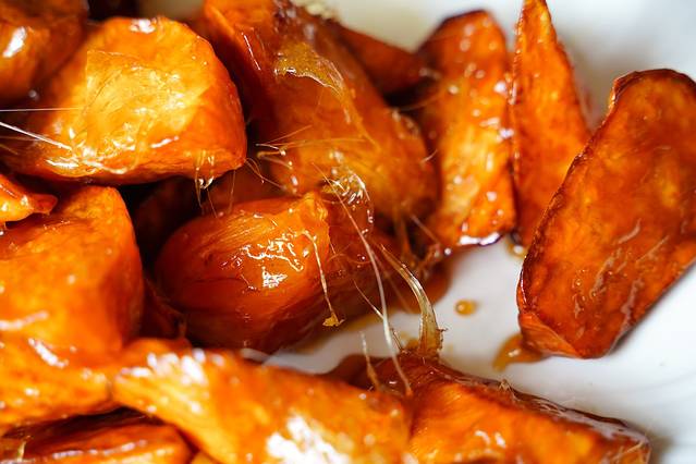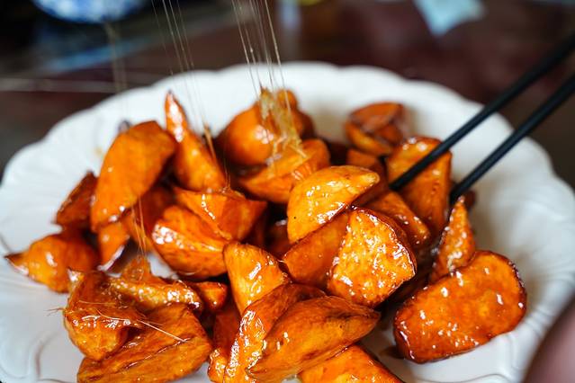 拔丝地瓜一定要趁热吃,味道很好,冷了之后糖就凝结在一起,不能拔丝了。