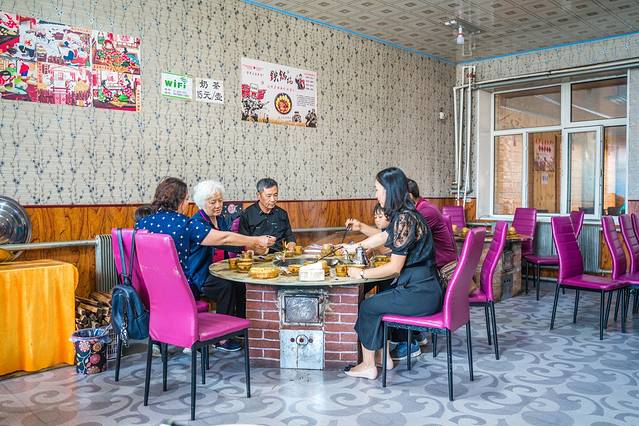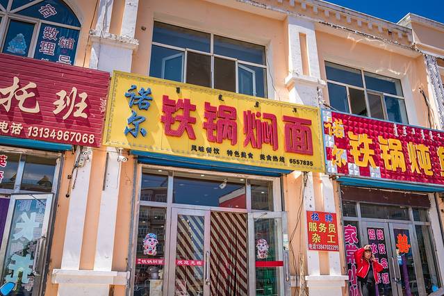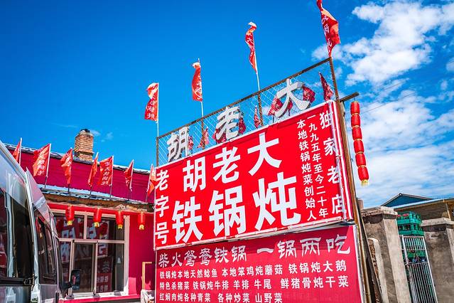 这几天连续转场奔波,所以一家人都睡了个懒觉,10点过了才从 室韦 慢悠悠出发,一路边走边玩,在午餐时间抵达了莫尔道嘎,这里曾经是 东北 伐木工人的道班,后来来的人多了就成为镇子,镇上 东北 菜非常正宗,最受欢迎的是一家开了二十年的老店-胡老大铁锅炖。