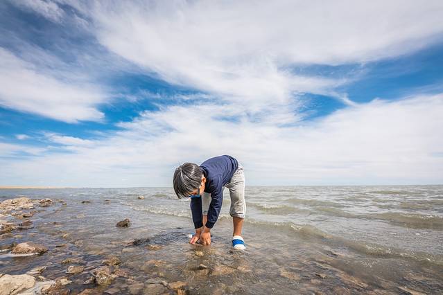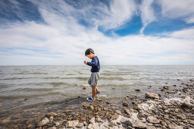 下到湖边,湖水还是很冰凉的,孩子兴奋的跑了进去,如果是到了暑期,温度更高一些,可以给孩子准备泳衣,玩水也能玩上一个下午