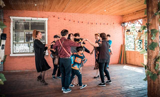 游戏结束,阿吉丽把我们带到院子里一起跳 俄罗斯 舞,整个家访的气氛也燃了起来,老一辈的人对苏联歌曲有着特殊情节,很快就融入进去,孩子们也跟着瞎凑热闹。