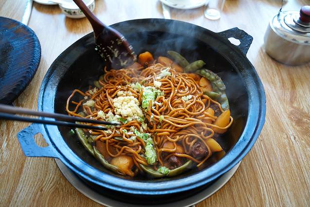 主要的食材是面条、土豆、豆角和排骨,焖熟之后,会加姜末蒜末一起拌匀,那香气真的是让人怀念啊,写游记时是半夜,口水都快滴到键盘上了