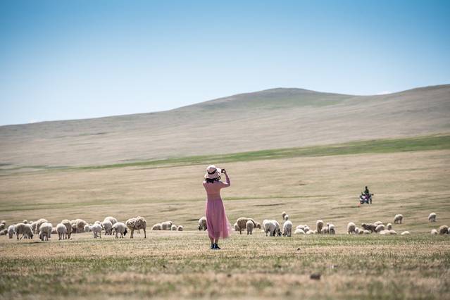 果然,牧羊人就骑着摩托车在远处暗中观察,你们来看羊,他很开心,但你们要吓羊,他就不乐意了,毕竟一只羊多长一斤肉,就是30多块钱啊,一群羊做个乘法那数字就相当可观了。