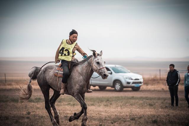一边焦急的等待,一 边和 孩子讲着草原三艺的传统,慢慢的就听到了远处传来马蹄的声音,一个穿着43号的孩子骑着一匹灰白相间的马冲过了终点,速度并没有我们之前我们想象的那么快,我问曙光,曙光说因为经过10公里的高速奔跑后,马匹都累得够呛,不可能还保持最初的步伐了,这是一个长距离的赛事,马匹的优劣不一样,也会拉开很长的距离,果然,往后一看,剩余的参赛者都在远处,稀稀拉拉的一条线,对于观赏性来说似乎起点会更好一些。