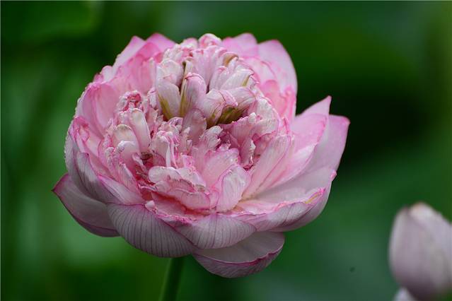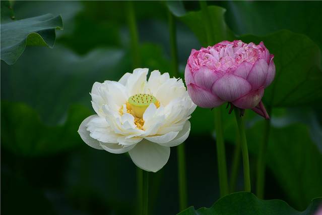 池中三三两两的粉色中还会看到一朵、两朵的白色夹杂其中,让人欣喜不已。白荷亭亭玉立,宛如穿着白色外衣的仙子一般,正可谓是出淤泥而不染,濯清涟而不妖,比粉荷更多了份清新淡雅。