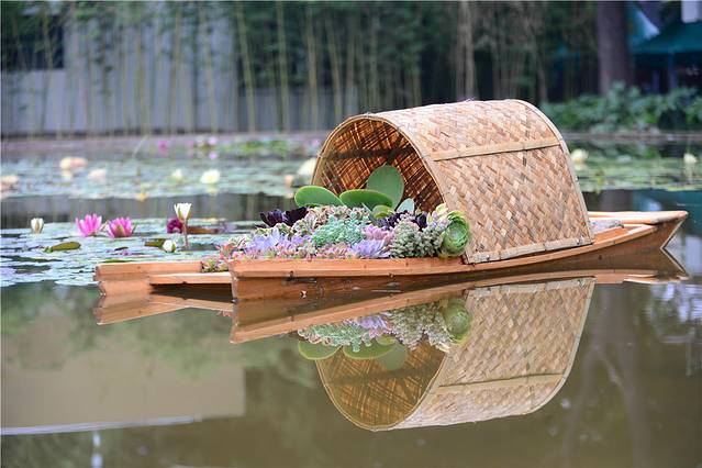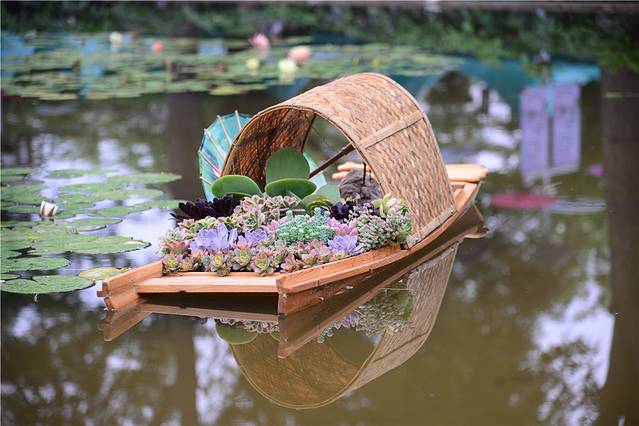 从入口往里走,经过长长的挂满油纸伞的小道,右侧的一池的睡莲惊艳了我的眼,莲花丛中有一艘满载着多肉的小船,一种江南水乡的即视感。