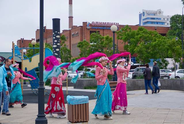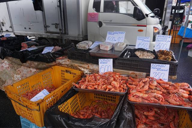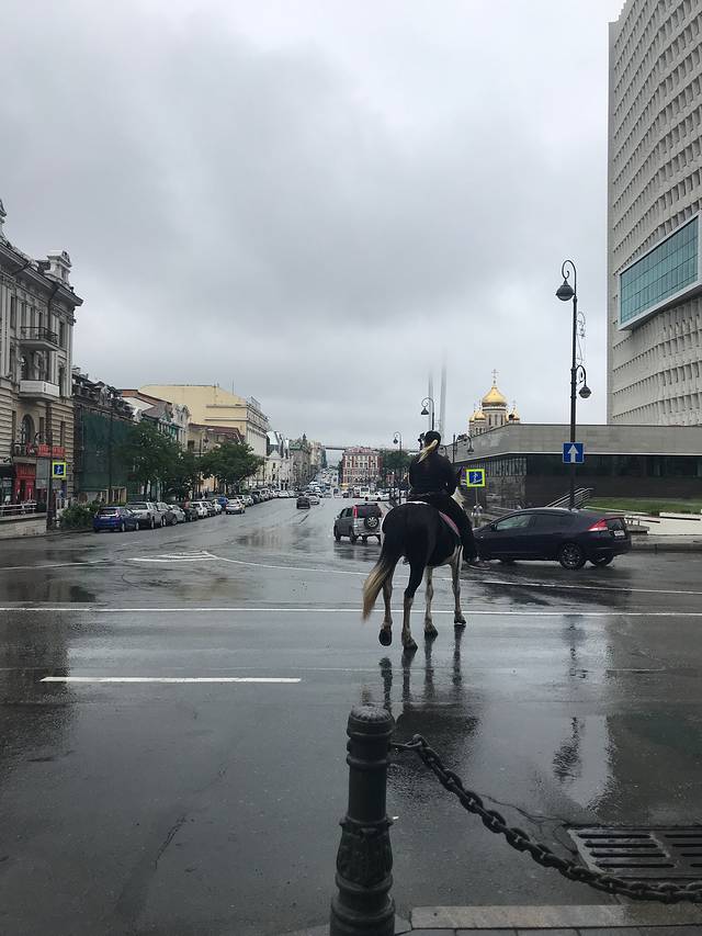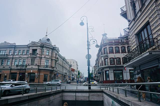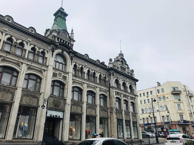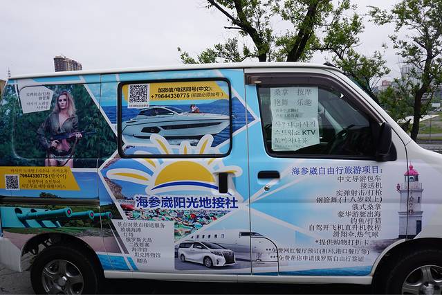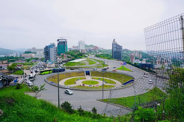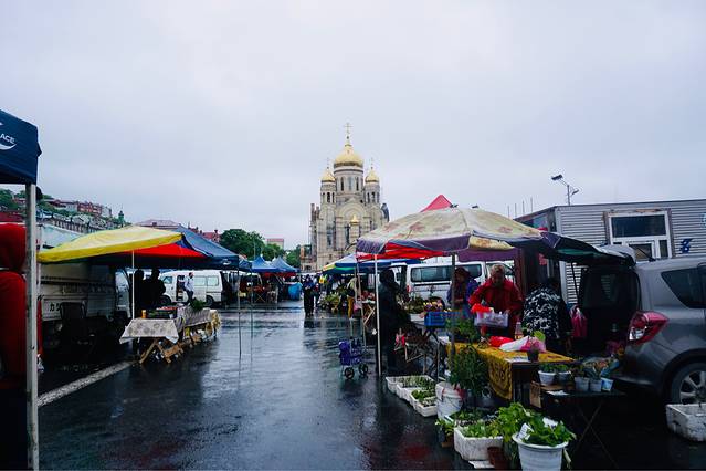 如果住在市中心,走过去就可以,可我们这个不知名的小旅馆住的偏僻,打车过去很远,花了250卢布,虽然不贵,但是因为俄罗斯打的便宜,开了半个多小时,一路都是山路坡路,海参崴的路都很小,不怎么划线,除了隔开方向的车道,就不划分几车道,但是司机素质都超级好,互相让车,拥堵的地方有序避开,海参崴司机开车确实猛,属于一点点路就马上加速,遇到堵车又立刻急刹的那种。然后车子呢普遍就是日本的二手本田和丰田,对,全都是从日本买来的二手车,据说日本过来的车子质量好,价格又便宜,和新车一样的丰田小两厢车一台才人民币2万元,所以在海参崴有多少车根本都无所谓,因为实在是便宜,据说还有边境跑来这边买路虎啥的,因为新车也比国内便宜太多。
