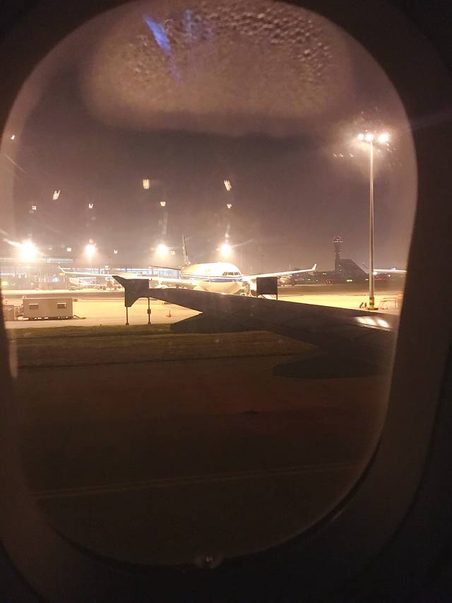 就是这架小灰机啦,很小吧。。。但是这个航班不用摆渡车,飞机上有餐饮,提供正常的热饮冷饮和三明治餐食,不过三明治是冰冻的,吃不下去,半夜也没有食欲。。。反正红眼航班从此再也不坐了,身体真的吃不消。。。