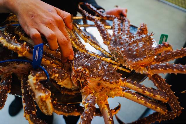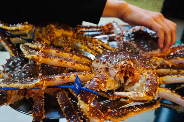 帝王蟹是必吃的,我们9个人,点3只蟹差不多,每一只都在4斤左右,烧之前会先给我们看活的,然后帅气小哥哥拿上来4只,我们惊呆了,四只大帝王蜘蛛蟹上来的排场真的不一般,挺壕挺壮观的,隔壁的外国情侣都过来拍照,后来担心钱包,还是留了3只。毕竟3000卢布一斤啊,真心吃不起。