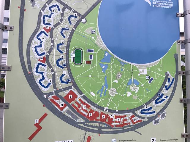 看还是蛮远的,这个大学在南面的俄罗斯岛上,由于我们的旅馆是在这个图尖尖的锐角所在的绿色山坡地区里面,交通不便,必须打车。这里再次安利一下上面的打车软件,因为一个手机只能打一辆车,我就让其他两个年轻人也下载这个软件,他们说都很难安装成功,于是有一批姐姐们就自己出门招手打车,结果400左右的车费,他们那个司机讹诈了800卢布。如果用软件打车,我会说不用找零多给点,但是不会有司机敢讹你,合理价格都会在手机上显示的。