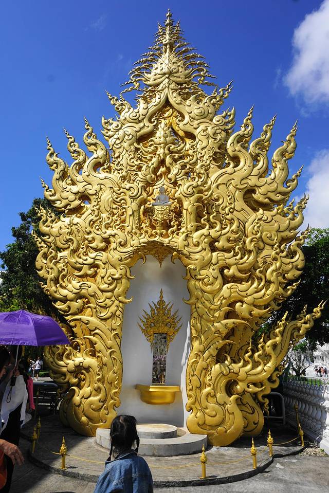 白庙本名白龙寺,也叫龙昆寺、灵光寺、洼龙坤。从远处看,这座寺庙似乎是用闪闪发光的瓷器建造的,走进了看才会发现这种错觉是由白色涂料和玻璃亮片造成的。白庙以素白做底,银镜镶边,静谧地反射出夺目的光芒。它通身无一处镶金,银白如一支支纤纤的手,柔柔地伸向天空。