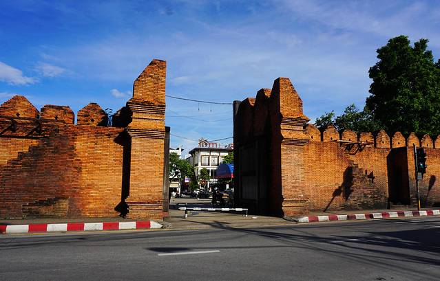 清迈古城建于1296年,是由褐红色砖墙围起的两米左右高的正方形城门。可惜大部分建筑都在岁月的更迭中消失了。现在留下最完整的一座城门是东边城墙的塔佩门。