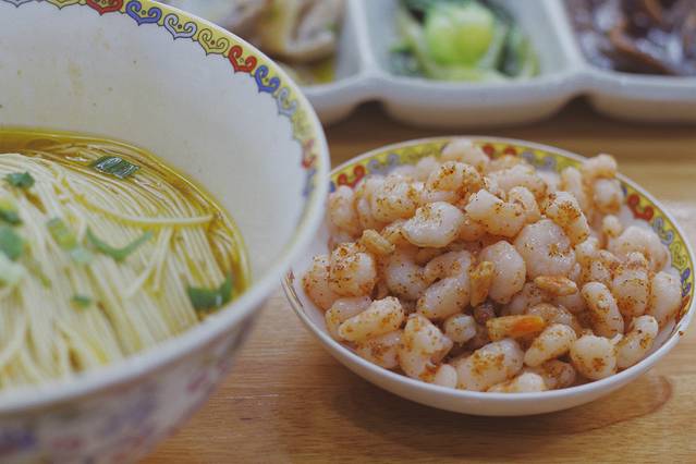 后来询问了店里的阿姨才知道,四月并不是三虾面上市的时令,但是店家通常会在上市时就备好存货,待到过季之后每天限量供应。听罢心里暗暗窃喜,庆幸自己吃到了限定美味。因此,特意选了个靠窗的位置,想要好好享用这顿珍贵的三鲜面。