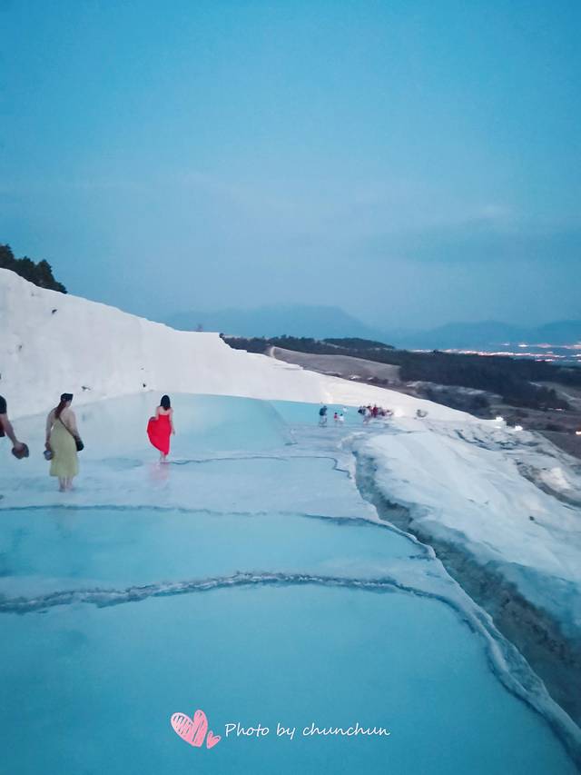 我们是下午4点多点到的棉花堡,路上我又不争气的自己睡着了,据森哥说一路风景也是秀色可餐。四点到了酒店入住,让森哥休息了一会,我们打算先去觅食,四点紫外线还是很强的,加上日落比较晚,我们就决定吃了饭再进去,大概六点买了门票进去,因为是夕阳,拍照不是很好啦,阳光正好打在身上,感觉整个人黑黑,拍出来的比起眼睛看到的差了十万八千里呢,但是美景真的是被尽收眼底,一进去就觉得好神奇啊,好美啊,太推荐这里了,没怎么拍照一直赶着上山,然后又溜达去了后面的遗址区,主要是去大剧院看日落去了,感觉这是土耳其全程最浪漫的日落了,我和森哥静静的感受日落,森哥说看到这些石头依稀能感觉老城区的存在,八点一刻日落我们开始下山,太美太美,蔚蓝的水面,波光粼粼,闪着微光,慢慢的天色已经完全黑下来。