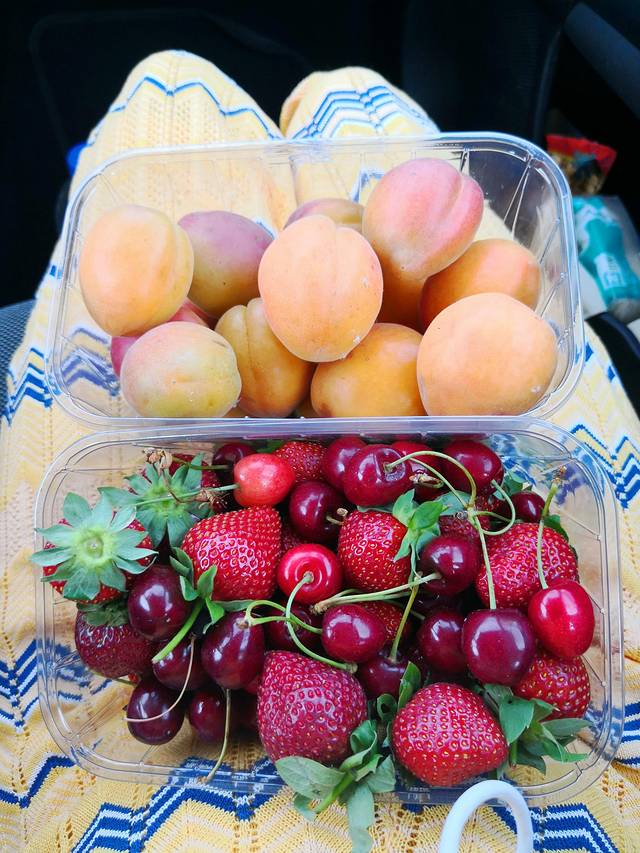 路上买的水果,好吃又便宜,两盒子一共20,和青岛下杏的时间一样,超级好吃。
