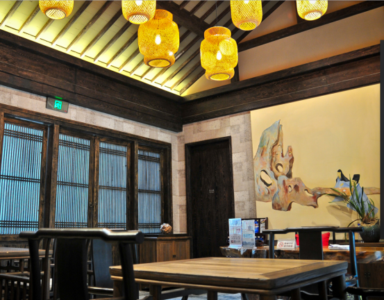 相比灵山拈花湾景区内的人挤人,这家店古朴典雅,颇有些大隐隐于市的意味。店面在拈花湾莲花表演旁,坐在观景座就可以直接欣赏外面的莲花表演,是旅途中休闲小憩、闲聊八卦的不二之选。