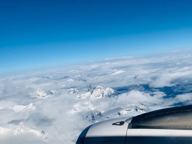 林芝上空,云朵下的雪山 。